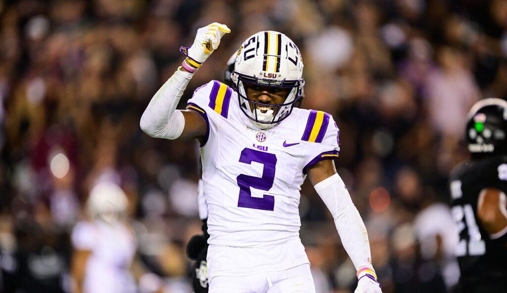 Kyren Lacy of the LSU Tigers celebrates a sack during the second quarter against the Texas A&M Aggies at Kyle Field on October 26, 2024 in College Station, Texas. (Gus Stark/LSU/University Images via Getty Images)