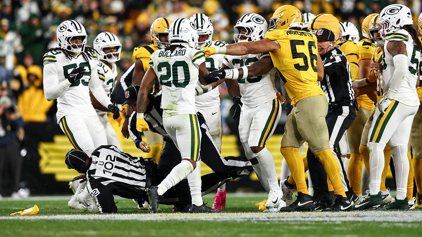 Referees try to separate the Pittsburgh Steelers and Green Bay Packers after a fight during the second half at Acrisure Stadium in Pittsburgh, PA on October 26, 2025. (IMAGE)