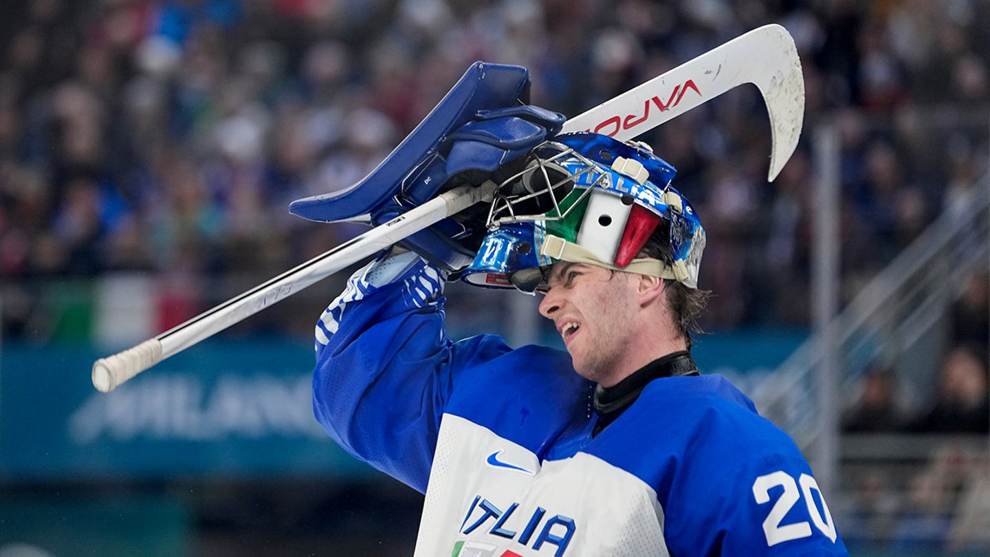 Italian goalkeeper Damian Clara adjusts his helmet during a men’s ice hockey preliminary round game against Finland at the 2026 Winter Olympic Games in Milan, Italy, Feb. 14, 2026. (Hassan Ammar/AP Photo)