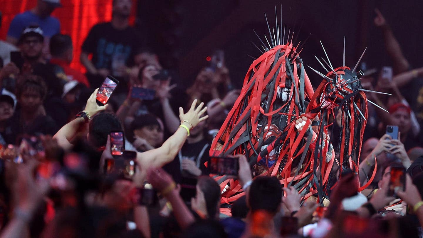 Balor headed to the ring in his “Demon” gear, dripping red and black paint. Mysterio was masked with other Mysterio followers.