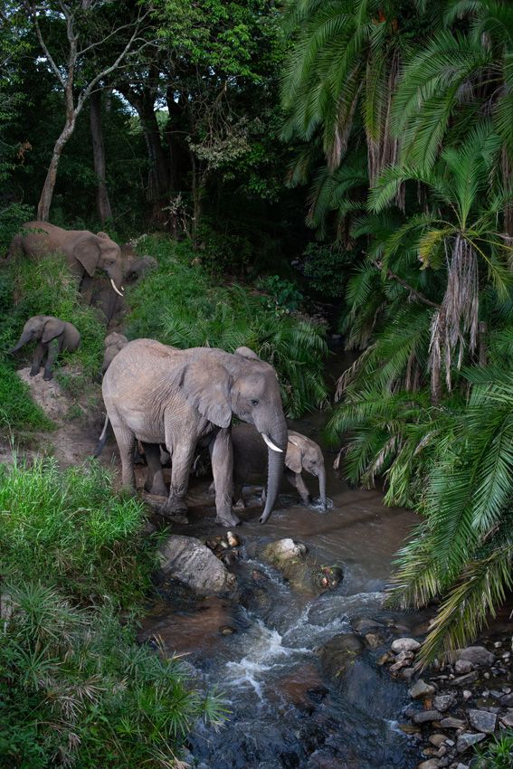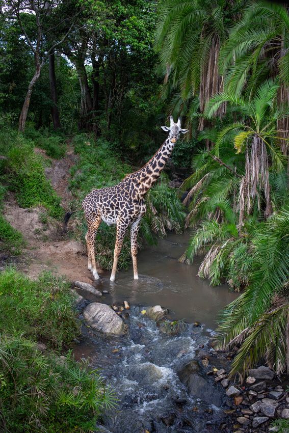 He had access to closed areas of the national park where there are a concentration of particularly rare wildlife species, including the notoriously shy rhinoceros. A stream surrounded by lush vegetation was the setting for the vital project, an unusual setting for a park typically known for its wide plains. “The moment I saw it, I knew it was the right place,” Burrard-Lucas says.