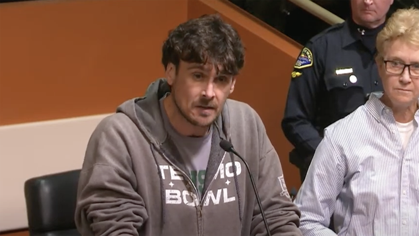 Former NFL punter Chris Kluwe protests during the Huntington Beach, California, City Council meeting. (City of Huntington Beach)