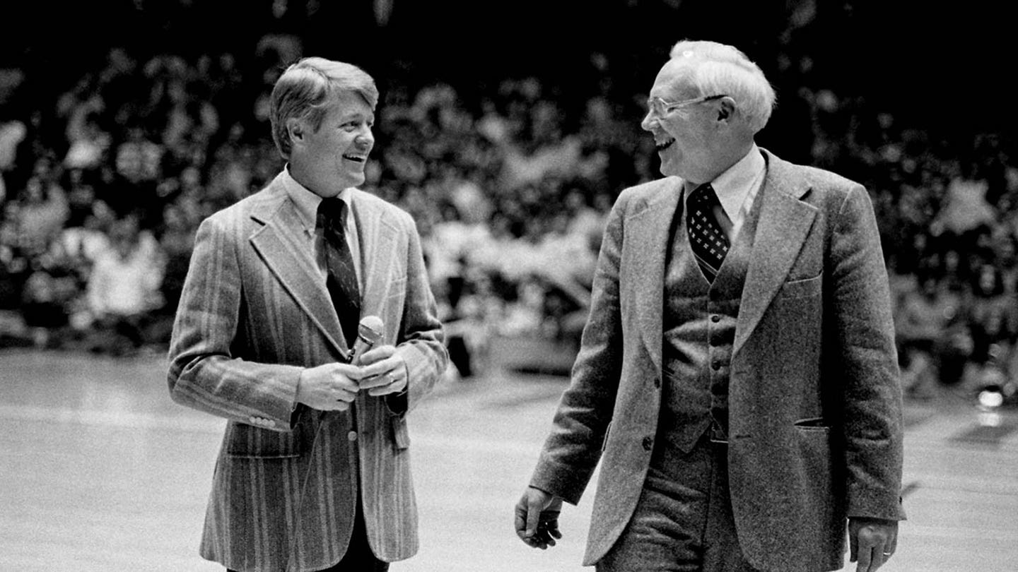 George MacIntyre, left, Vanderbilt’s new football coach, shares a moment with athletic director Roy Kramer after Kramer announced McIntyre’s hiring during halftime of Vanderbilt’s basketball game against the Citadel at Memorial Gym on Dec. 4, 1978. (Robert Johnson/The Tennessean)