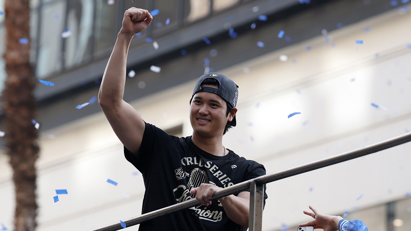 Los Angeles Dodgers two-way player Shohei Ohtani acknowledges the crowd during the World Series championship parade in downtown Los Angeles on November 3, 2025 in Los Angeles, California. (Kiyoshi Mio/Image Images)