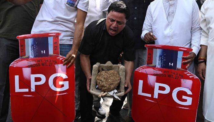 Indian Opposition Congress party workers stage a protest against rising prices and shortages of liquefied petroleum gas (LPG) in New Delhi on March 13, 2026. — AFP