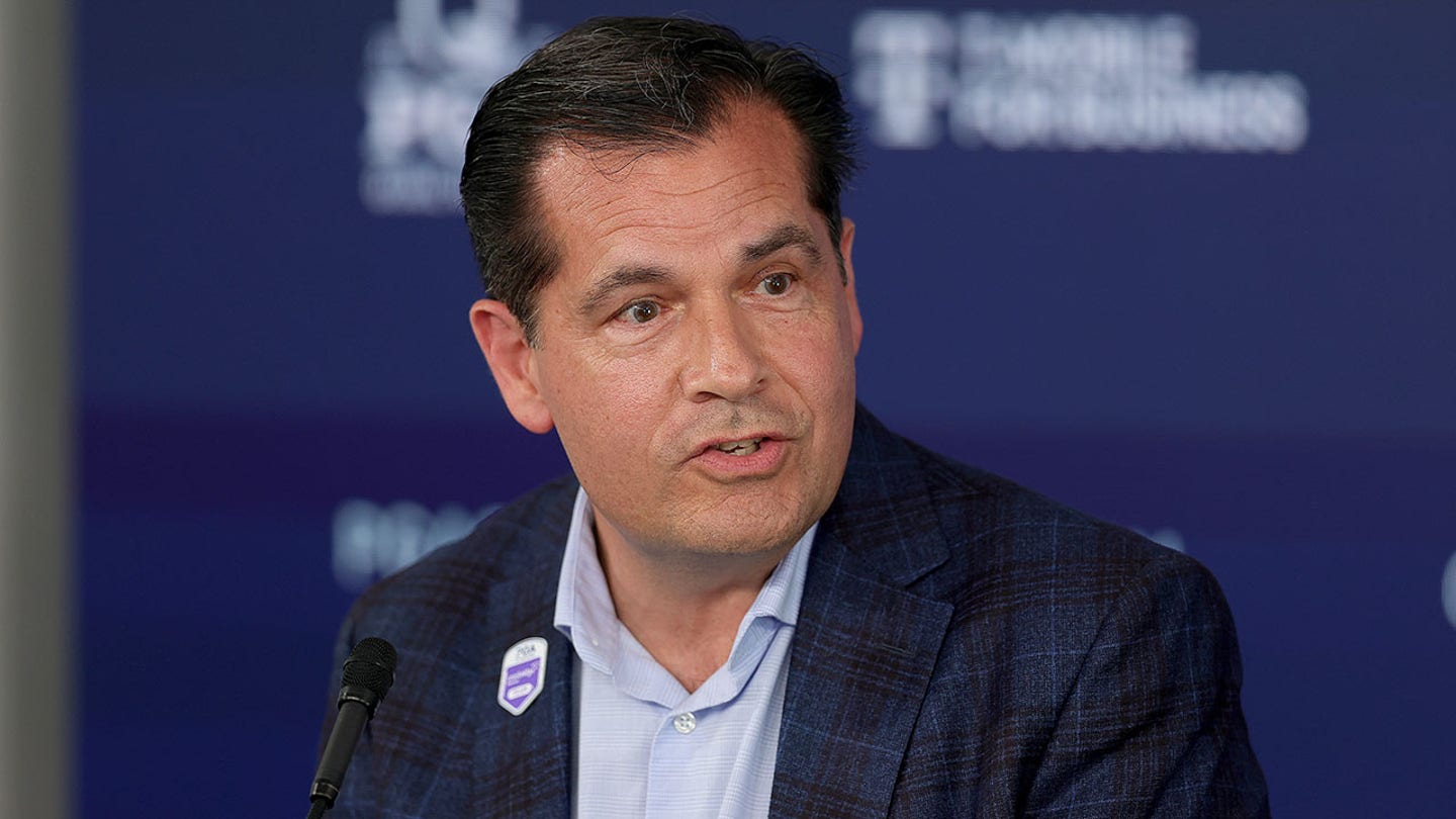 PGA of America CEO Derek Sprague speaks to the media before the PGA Championship at Quail Hollow Country Club. The event took place in Charlotte, North Carolina on May 13, 2025. (Andrew Redington/Getty Images)