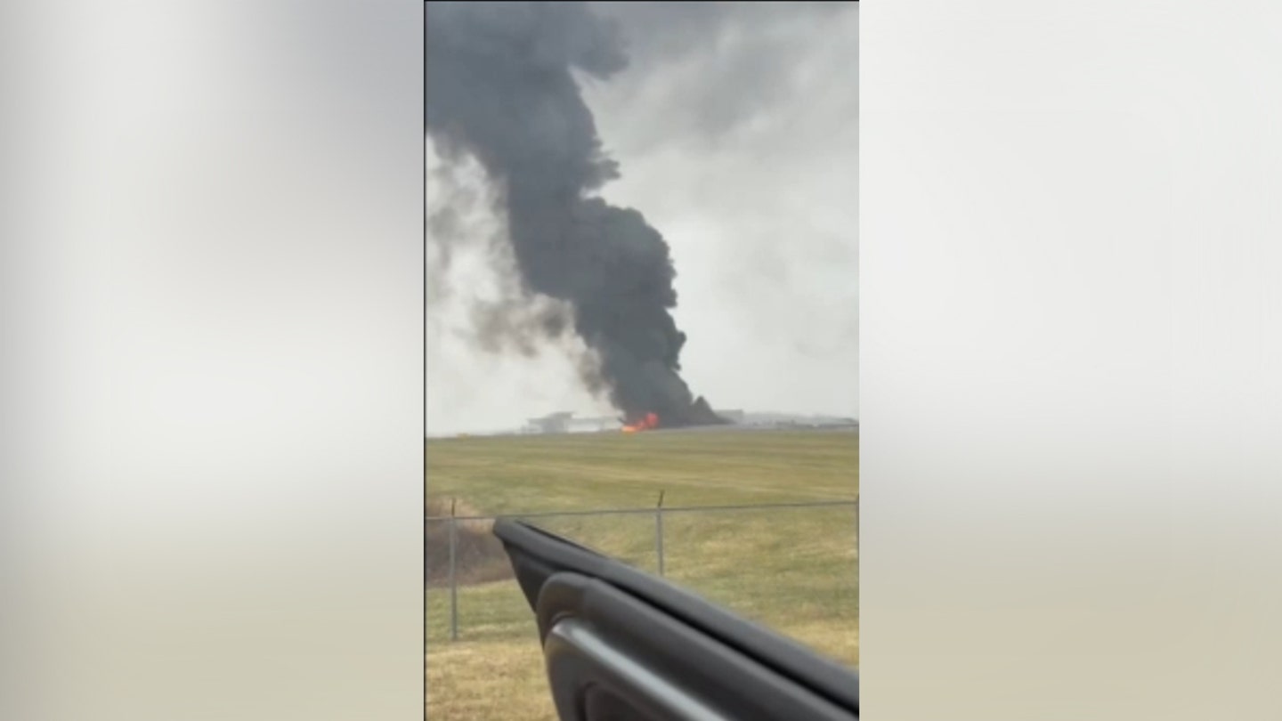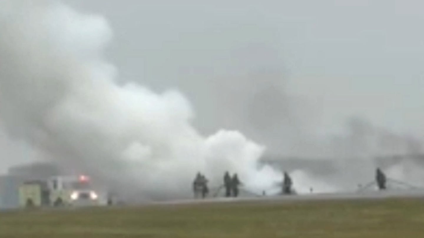 Video from the scene showed first responders running toward the runway as flames burned near the scattered wreckage of the plane.