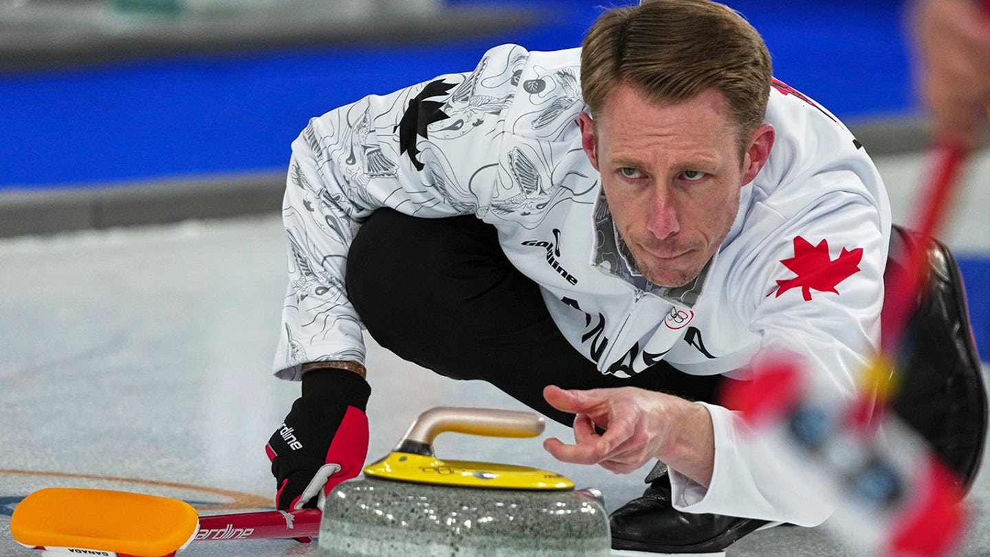 Marc Kennedy of Canada in action during the men’s curling round robin session against China, at the 2026 Winter Olympic Games, in Cortina d’Ampezzo, Italy, Sunday, February 15, 2026. (AP Photo/Misper Apawu)