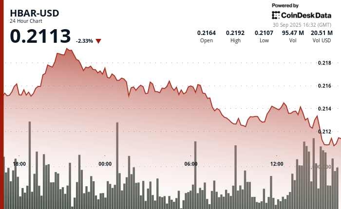At the end of the afternoon of September 30, Hbar recovered briefly before sliding again to the intra -intradia around $ 0.21. High commercial activity during the final time, of 5.9 million tokens in a single interval, illuminated the intensity of the institutional rebalancing. The Token ended the session with a modest stabilization about $ 0.21, but market observers warned that continuous volatility can persist as corporate strategies adapt to winds against regulatory changes.