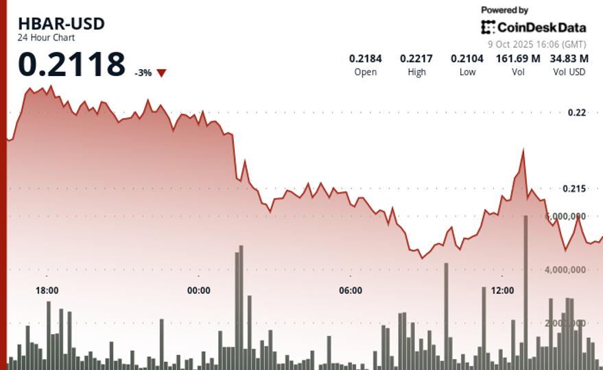 Hedera Hashgraph’s HBAR token fell nearly 5%, from $0.22 to $0.21, between October 8 and 9, as institutional caution deepened amid ongoing regulatory uncertainty. Volatility increased to 5.4%, with strong selling between 01:00 and 08:00 on October 9 pushing volumes above 100 million units per hour. Analysts cited strong resistance at $0.22 and institutional support near $0.21 as key technical levels.