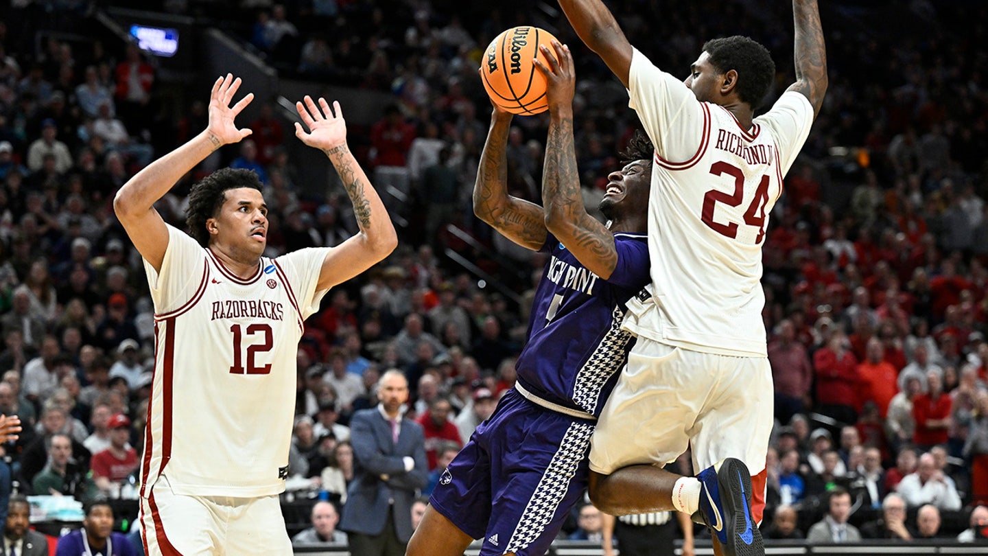 Arkansas will face the winner of No. 1 Arizona and No. 9 Utah State in the Sweet 16.