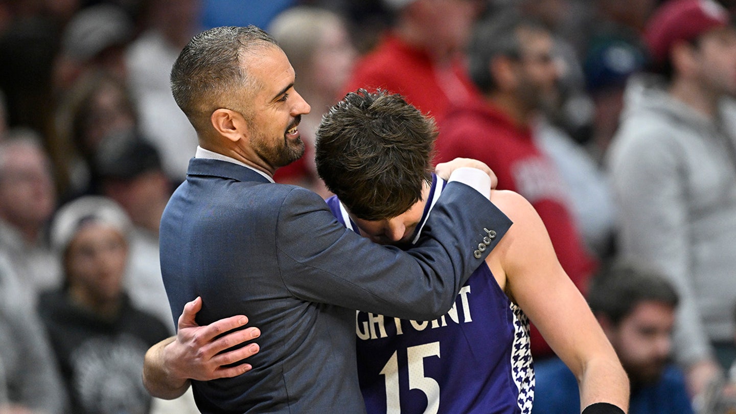 High Point Panthers head coach Flynn Clayman and guard Rob Martin (3) react in the second half against the Arkansas Razorbacks during a second round game of the 2026 NCAA men’s tournament at Moda Center. (Craig Strobeck/Image Images)