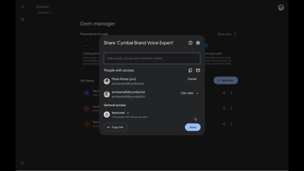 There are limits. Some gems are not eligible to share, especially if they contain private loads or links to confidential data sources. And even when he shares a gem, the recipient may need access to files inside, as if he uses a personal Google document. The system warns you mainly when it can be a problem, but not always with excellent specificity.