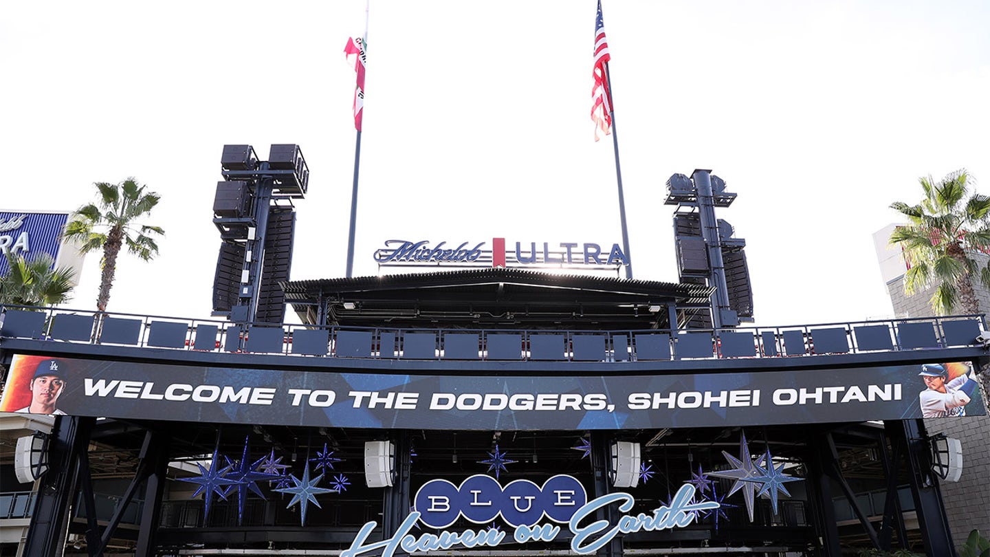 The stage before Shohei Ohtani is presented by the Los Angeles Dodgers at Dodger Stadium on December 14, 2023 in Los Angeles, California. (Meg Oliphant/Getty images)