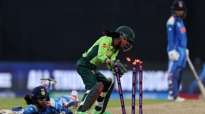 Pakistan’s Wicktkeeper tries to touch an Indian batter during the ICC Women’s World Cup match at the R. Colombo R.