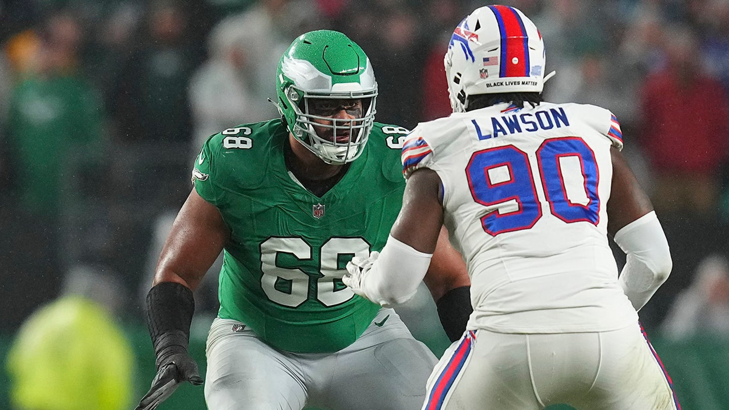 Jordan Mailata of the Eagles blocks Shaq Lawson of the Buffalo Bills at Lincoln Financial Field on Nov. 26, 2023 in Philadelphia. (Mitchell Leff/Getty Images)