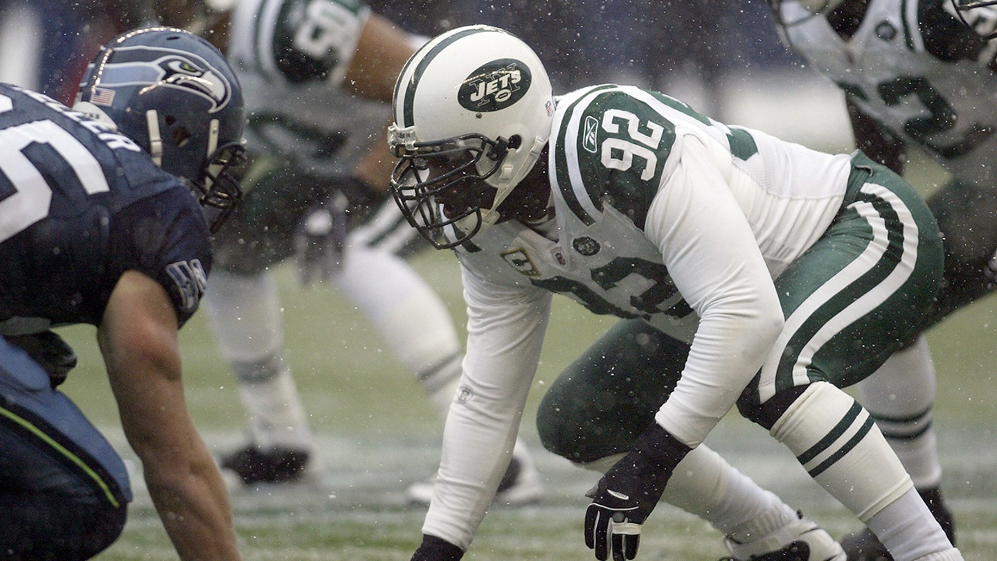 New York Jets defensive end Shaun Ellis takes a line of scrimmage against the Seahawks at Quest Field in Seattle on December 21, 2008. (Jesse Beals/Icon SMI/Icon Sport Media via Getty Images)