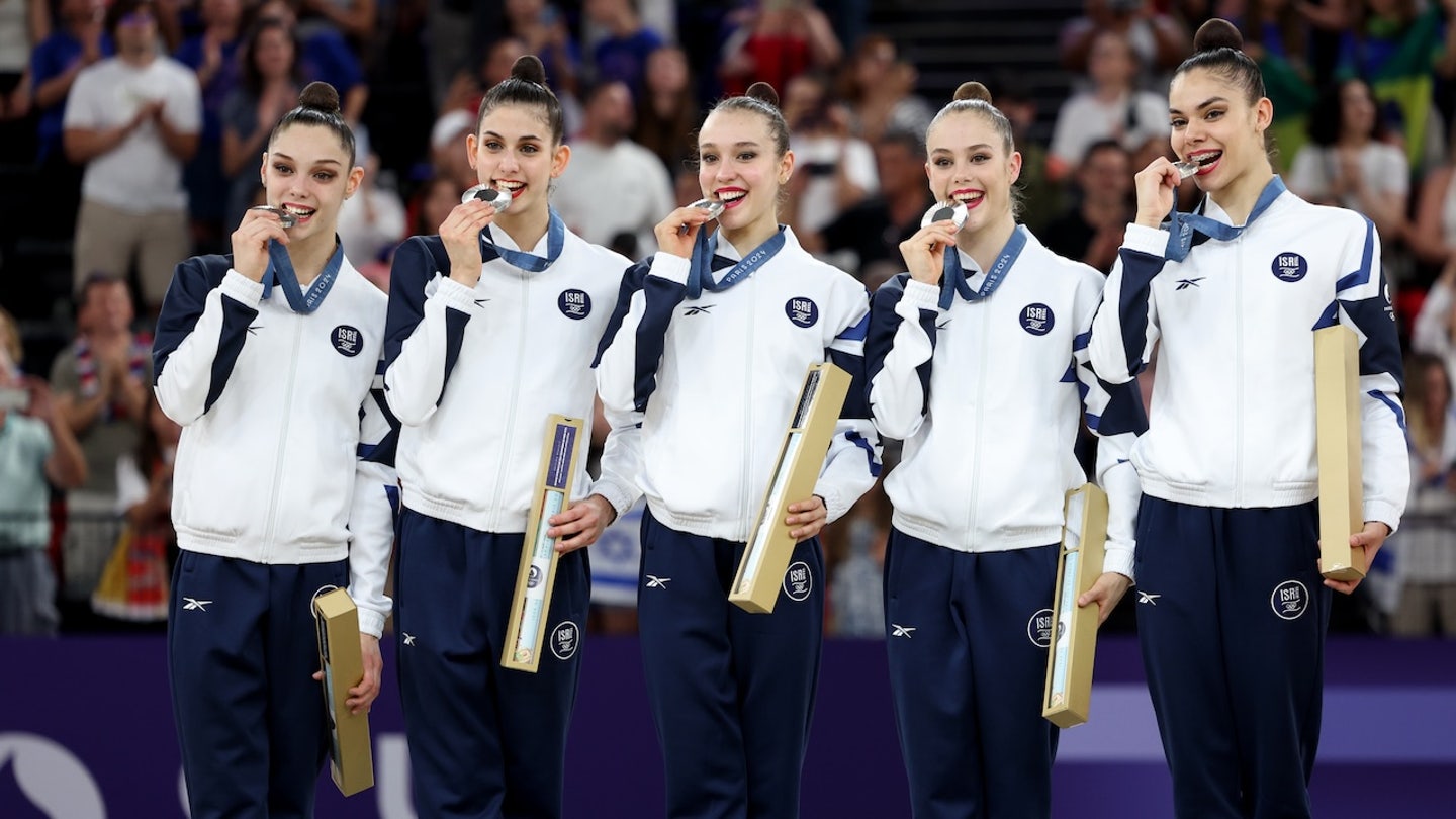 Team Israel’s silver medalists celebrate on the podium during the medal ceremony of the Rhythmic Gymnastics Group All-around final on day fifteen of the Paris 2024 Olympic Games at the Porte de La Chapelle Arena on August 10, 2024, in Paris, France. (Jamie Squire/Getty Images)