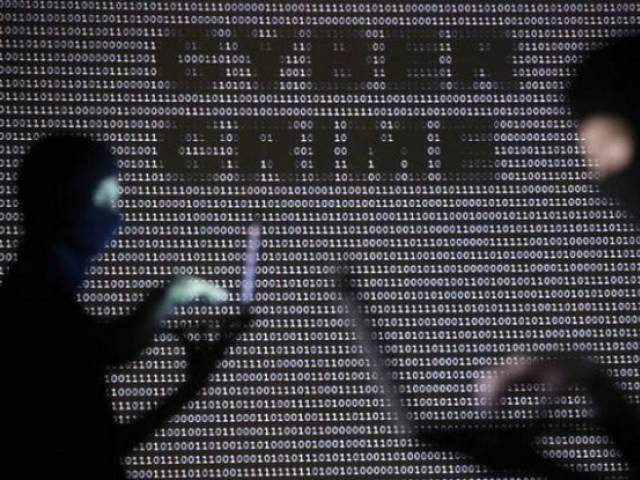 Silhouettes of people wearing balaclavas are cut out while posing with a laptop in front of a screen projected with the word “cybercrime” and a binary code. PHOTO: REUTERS