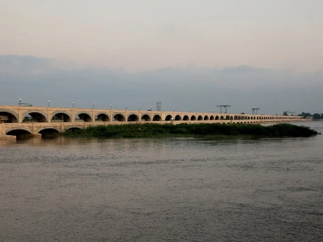 View of the Sukkur Dam, formerly known as Lloyd Dam, as flood water passes, following monsoon rains and rising levels of the Indus River in Sukkur, Sindh province. Photo: REUTERS