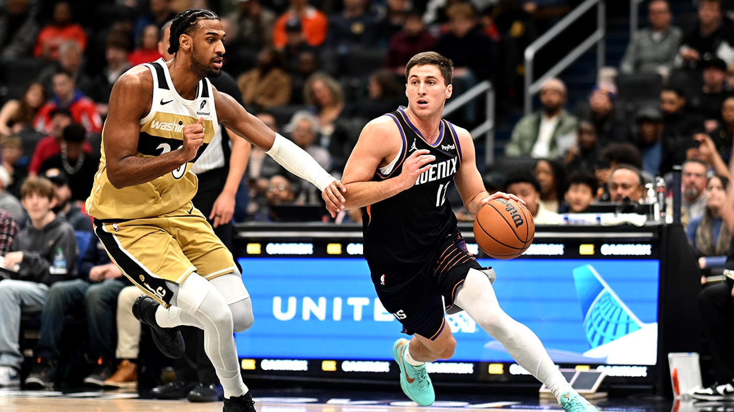 Phoenix Suns guard Collin Gillespie (12) dribbles past Washington Wizards center Alex Sarr (20) during the first quarter at Capital One Arena in Washington, District of Columbia, on December 29, 2025. (Rafael Suanes/Imagn Images)