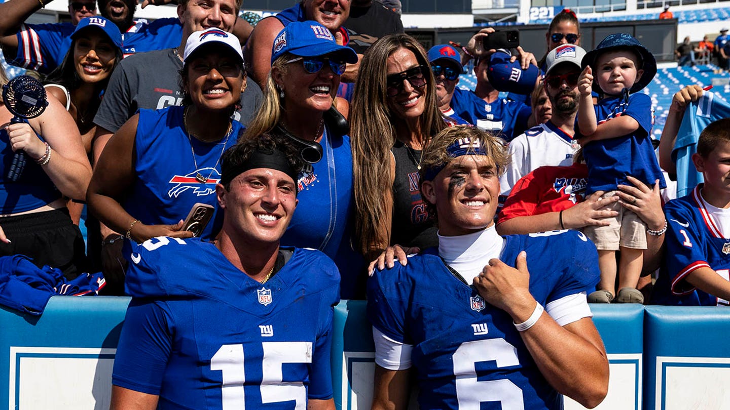 Tommy Devito #15 and Jaxson Dart #6 of the New York Giants phase for a portrait with their families after the NFL 2025 preseason game against the Buffalo Bills at the Highmark Stadium on August 9, 2025 in Orchard Park, New York. Kara Dart looks next to Jaxson. (Lauren Leigh Bacho/Getty Images)