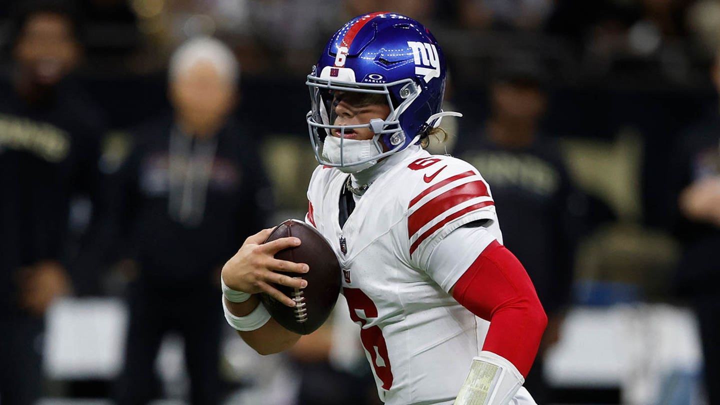 The New York Giants Campo Marshal, Jaxson Dart (6) stays out of pocket against the New Orleans Saints in the first half of a NFL football match, on Sunday, October 5, 2025, in New Orleans. (AP Photo/Butch Dill)