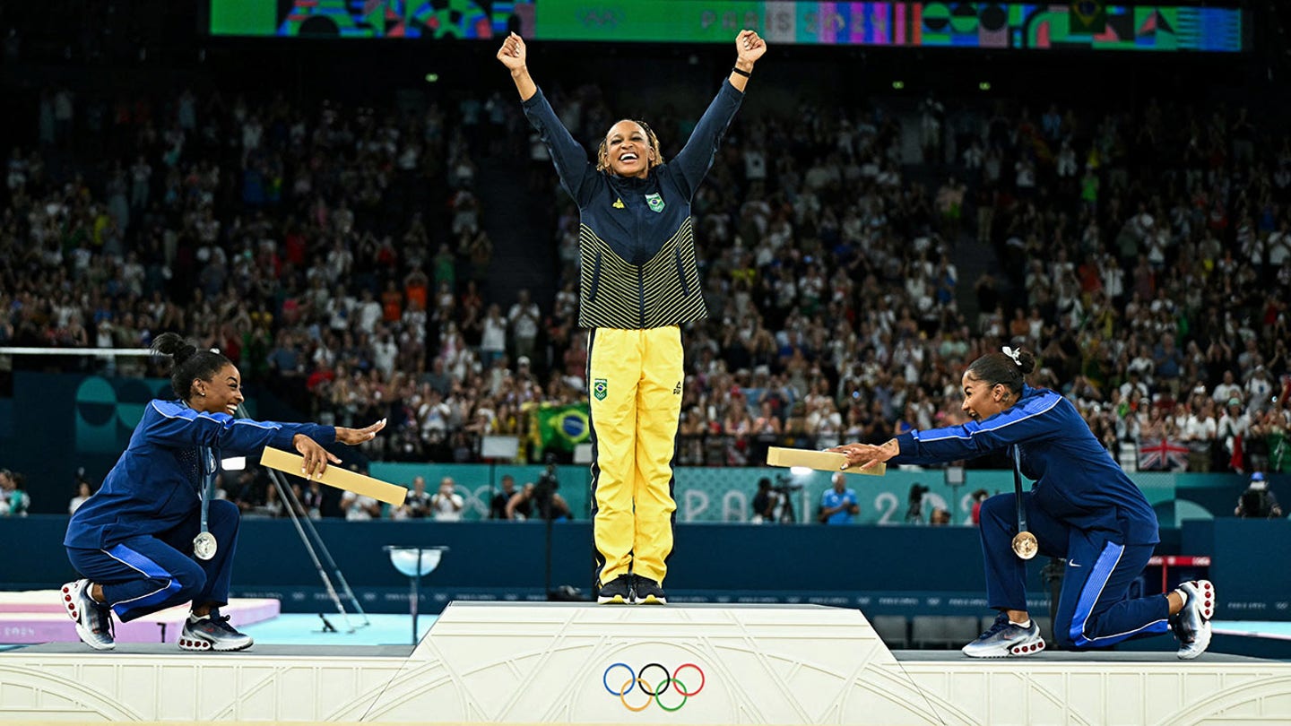 Simone Biles (silver), Brazil’s Rebeca Andrade (gold) and American Jordan Chiles (bronze) show sportsmanship during the podium ceremony for the artistic gymnastics women’s floor exercise event at the Paris 2024 Olympic Games at the Bercy Arena in Paris, August 5, 2024. (GABRIEL BOUYS/AFP via Getty Images)