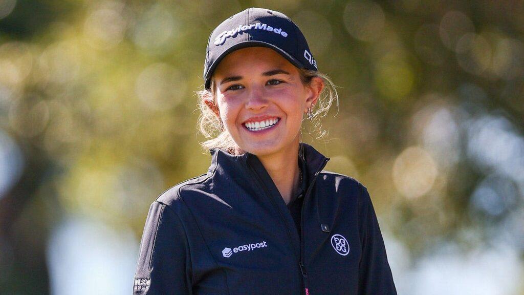 Kai Trump, a University of Miami commit, plays her tee shot on the second hole during The Annika at Pelican on Nov. 13, 2025, at Pelican Golf Club in Belleair, Florida. (Brian Spurlock/Sportswire Icon)