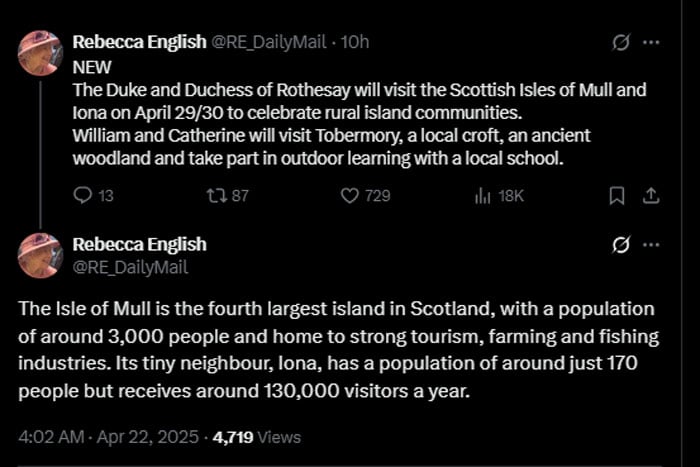 She tweeted: “The Duke and the Duchess of Rothesay will visit the Scottish Islands of Mull and Iona on April 29/ to celebrate the rural communities of the islands.