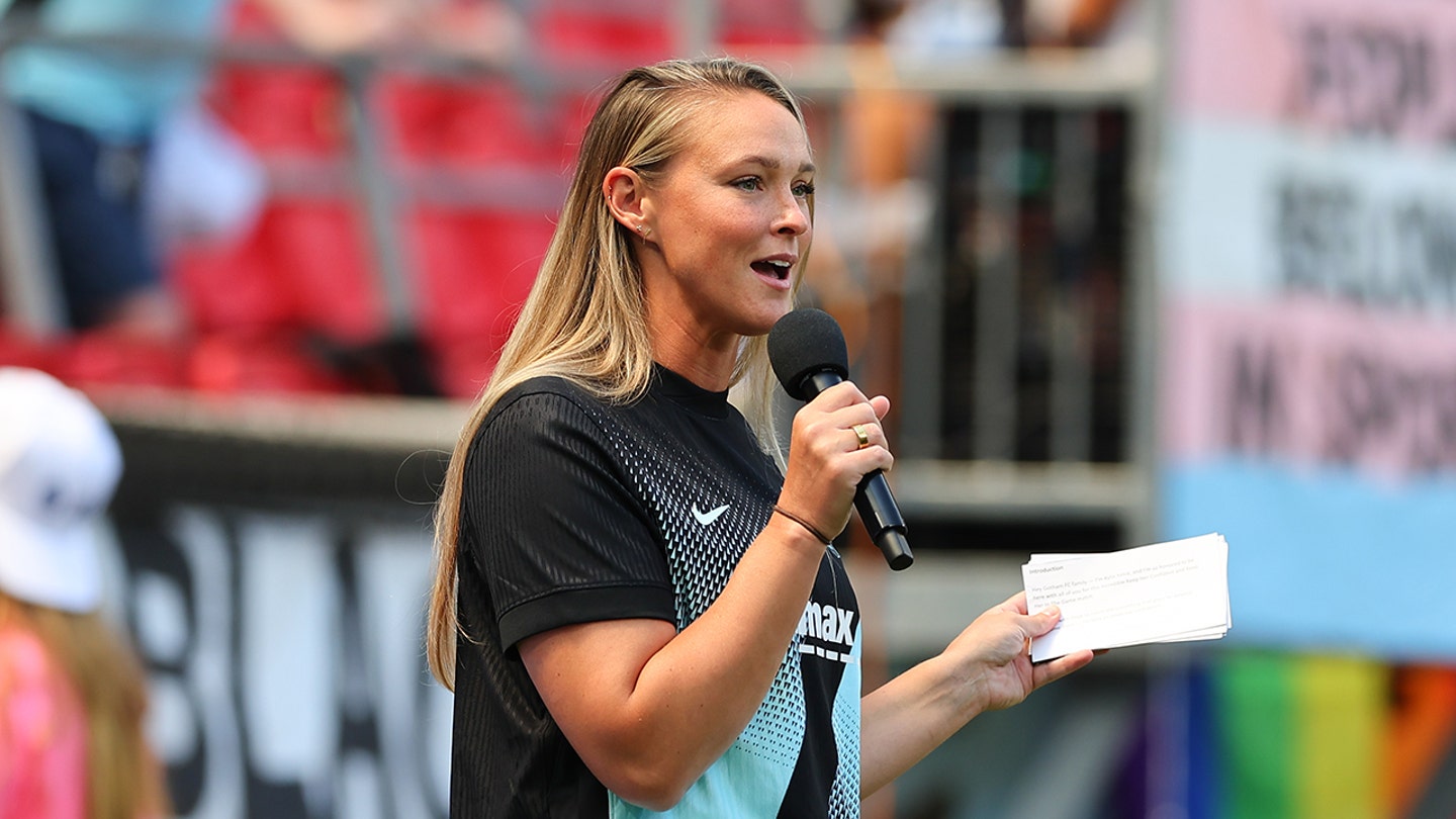 Kylie Kelce speaks to the crowd before the NWSL game on August 9, 2025 at Sports Illustrated Stadium in Harrison, New Jersey. (Rich Graessle/Icon Sportswire via Getty Images)