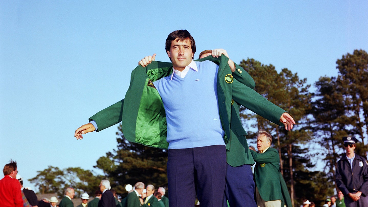 Seve Ballesteros puts on the green jacket during the 1983 Masters Tournament at Augusta National Golf Club on April 11, 1983, in Augusta, Georgia. (Augusta National/Getty Images)