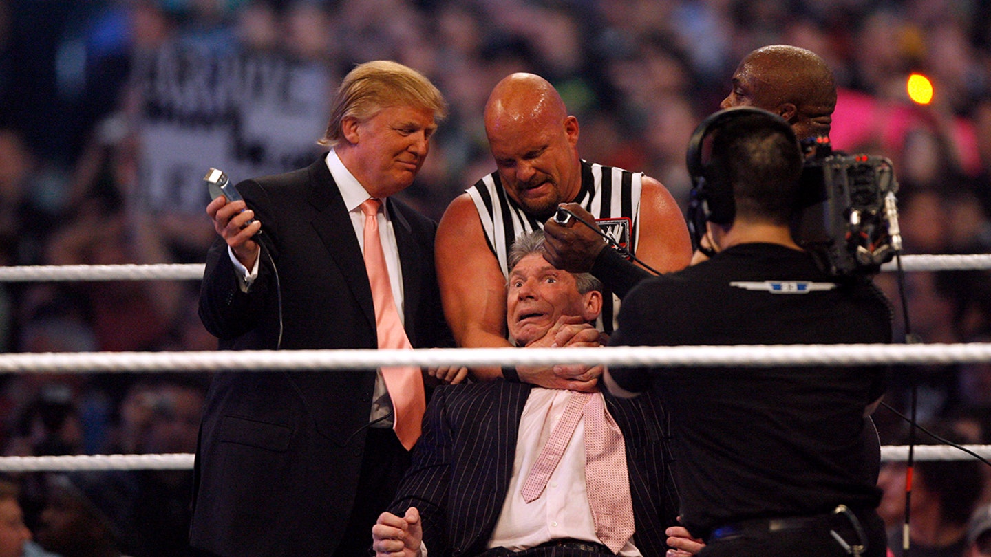 Donald Trump, Stone Cold Steve Austin and WWE wrestler Bobby Lashley prepare to shave Vince McMahon’s head after the McMahons lost the night’s main event, “Hair vs. Hair,” between Vince McMahon and Donald Trump. WrestleMania 23 at Ford Field in Detroit, Michigan on April 1, 2007. (Leon Halip/WireImage)