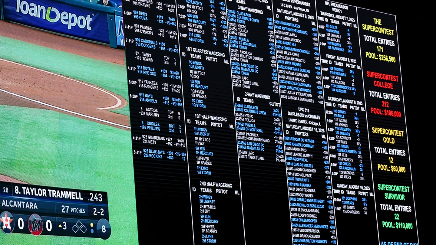A general view of betting odds on the video board at the Westgate SuperBook sportsbook on August 4, 2025 in Las Vegas. (Aaron M. Sprecher/Getty Images)