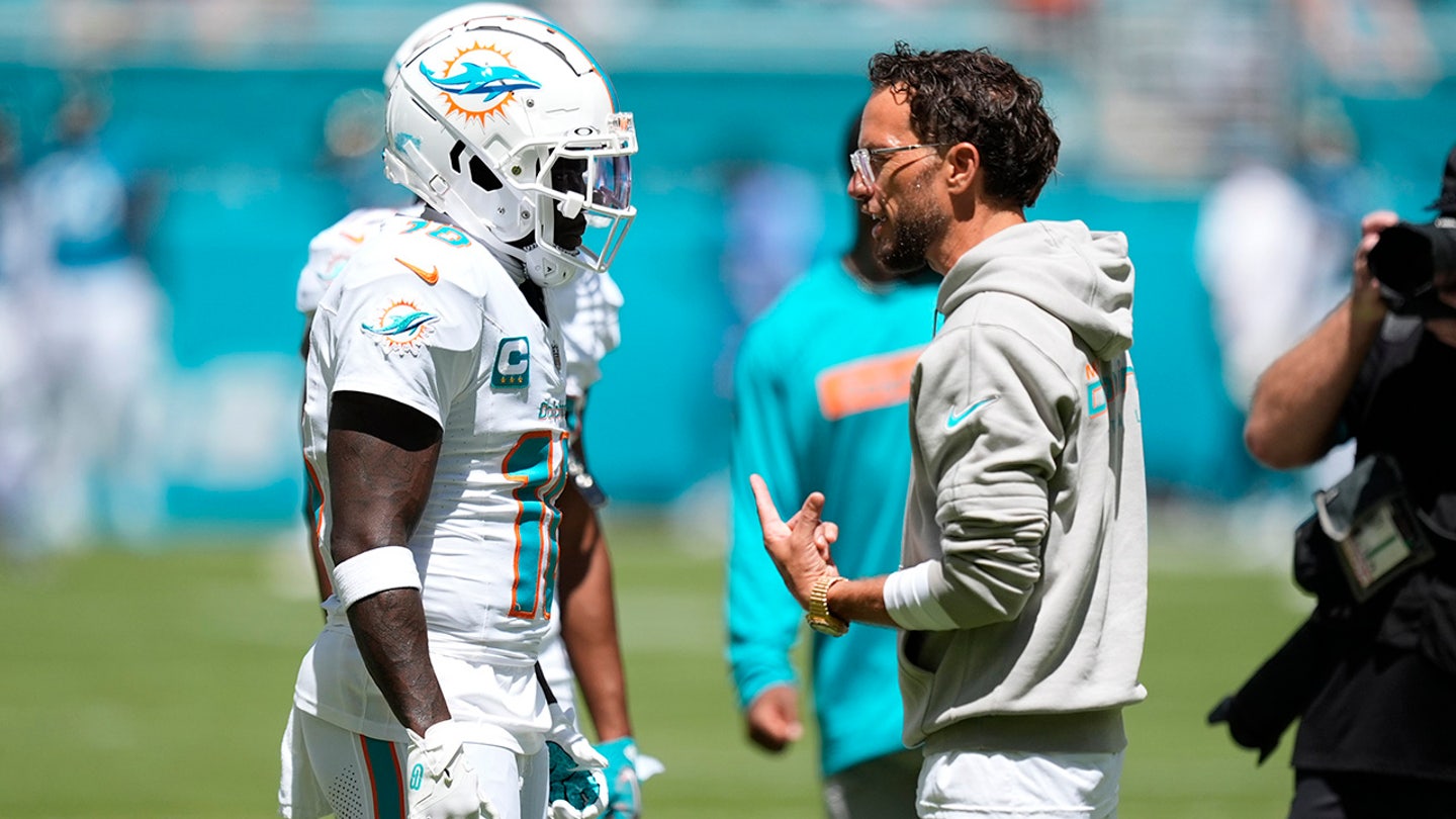 Miami Dolphins head coach Mike McDaniel talks with receiver Tyreek Hill (10) before an NFL football game against the Jacksonville Jaguars, Sunday, Sept. 8, 2024, in Miami Gardens, Florida. (AP Photo/Rebecca Blackwell)