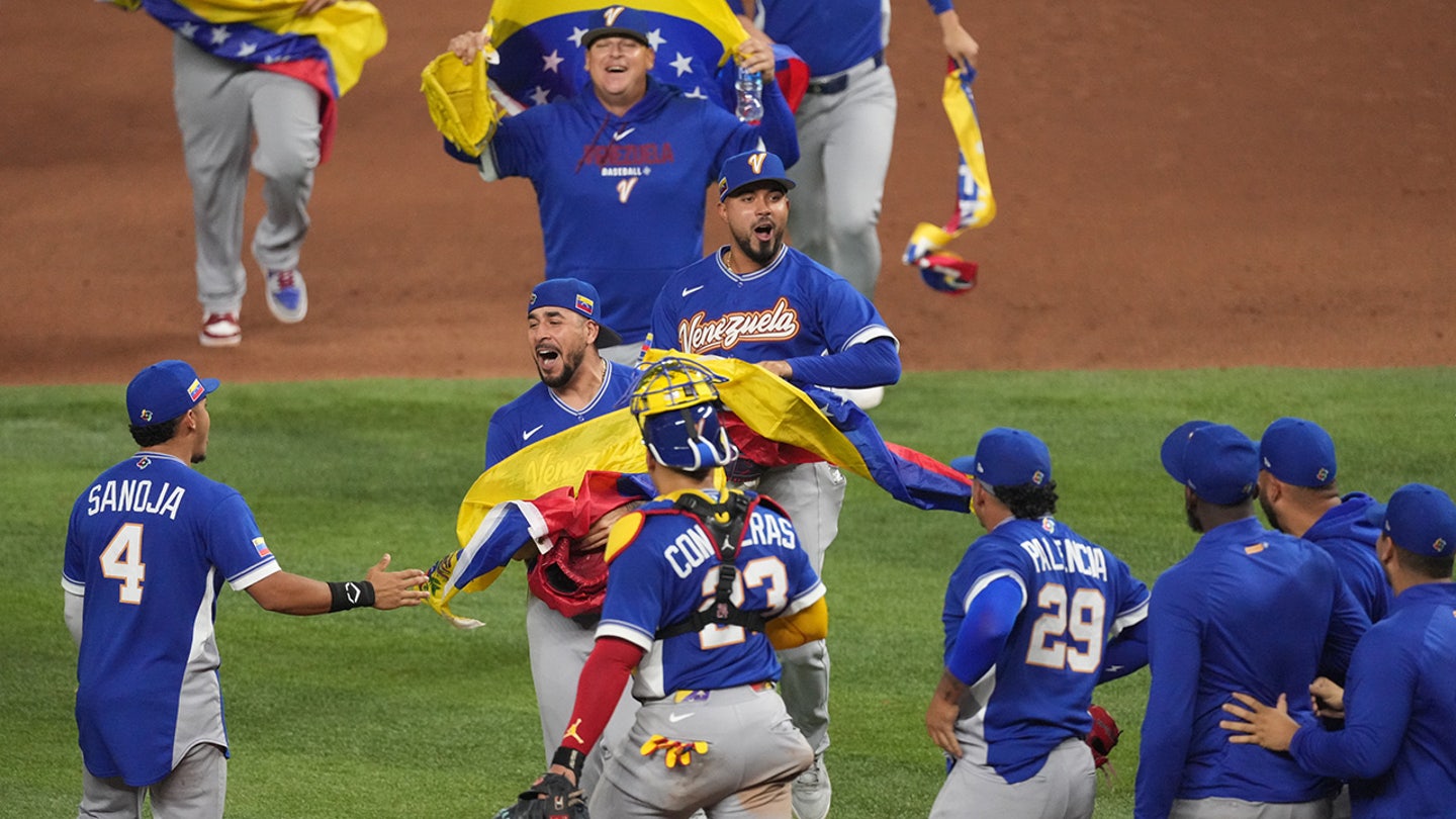 The Venezuelan national team celebrates after defeating Italy in the semifinal of the World Baseball Classic in Miami, Florida, on March 16, 2026. (AP Photo/Lynne Sladky)