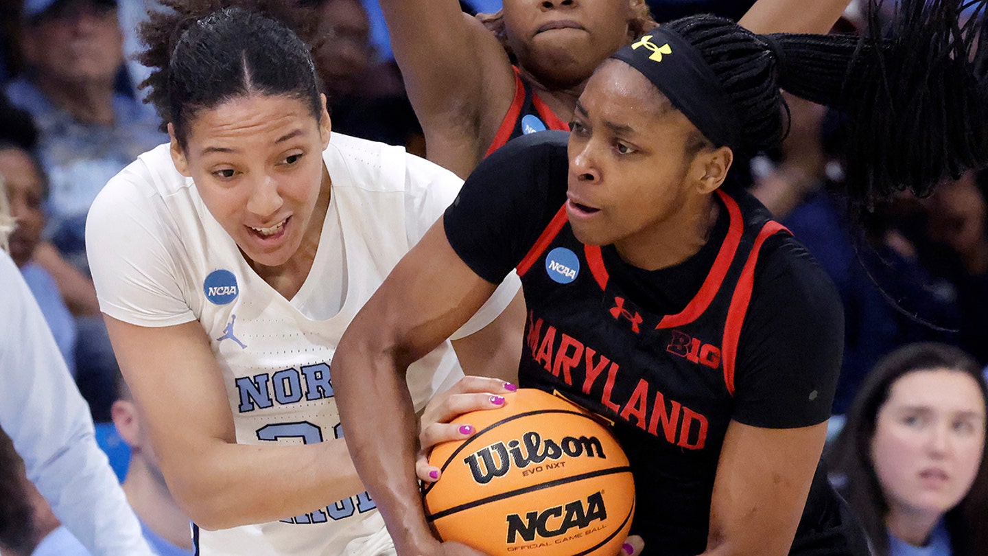 North Carolina guard Taissa Queiroz, left, battles Maryland guard Oluchi Okananwa, right, for the ball during the second half of the second round of the NCAA college basketball tournament, Sunday, March 22, 2026, in Chapel Hill, North Carolina. (AP Photo/Chris Seward)