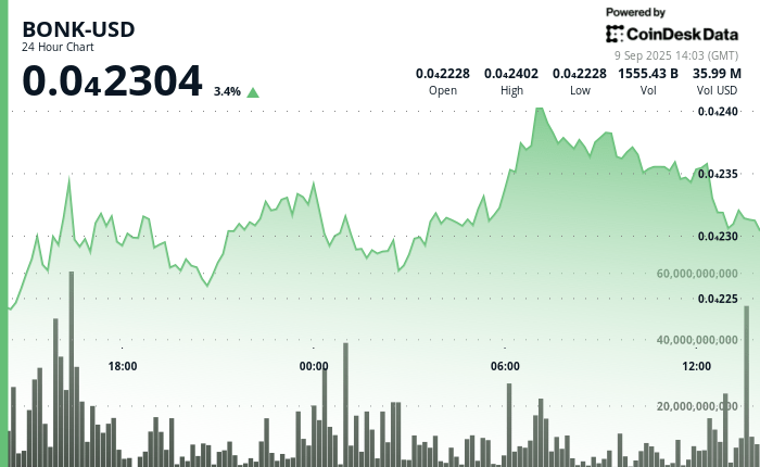 Bonk recovered more than 9% in the last 24 hours, moving from $ 0.000022 to a peak of $ 0.000024.
