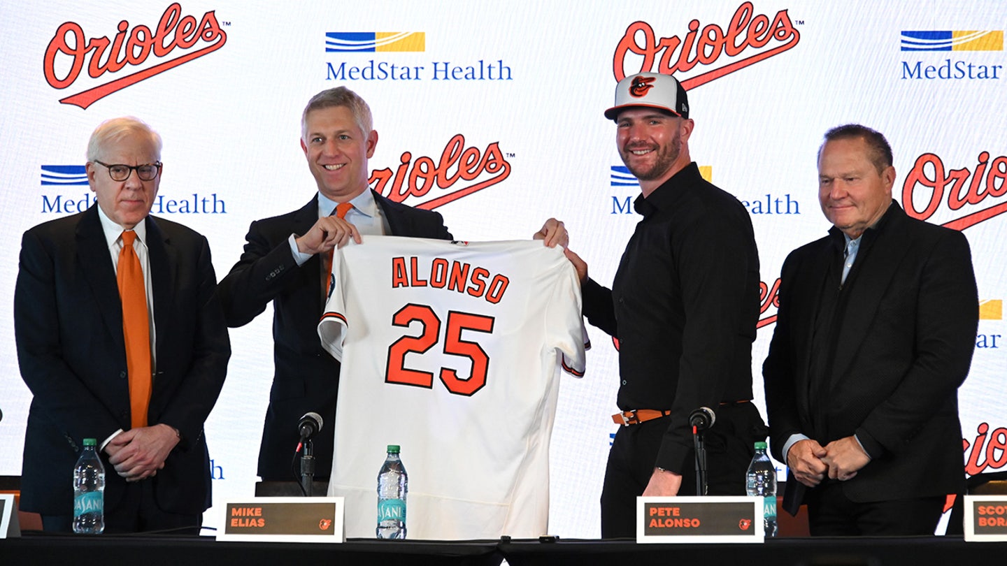 Baltimore Orioles owner David Rubenstein, president of baseball operations Mike Elias and agent Scott Boras introduce new first baseman Pete Alonso at a press conference at Camden Yards on Friday, December 1. December 12, 2025, in Baltimore. (Lloyd Fox/Baltimore Sun/Tribune News Service via Getty Images)