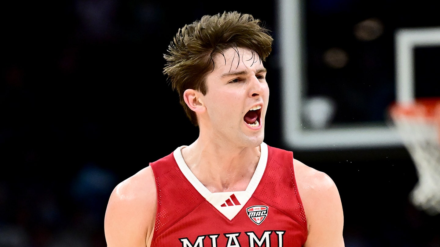 Miami (Ohio) RedHawks guard Peter Suder (5) celebrates after scoring a three-point basket against the Akron Zips during the first half of the MAC Conference Tournament Championship game at Rocket Arena in Cleveland, Ohio, on March 15, 2025. (Ken Blaze/Image Images)