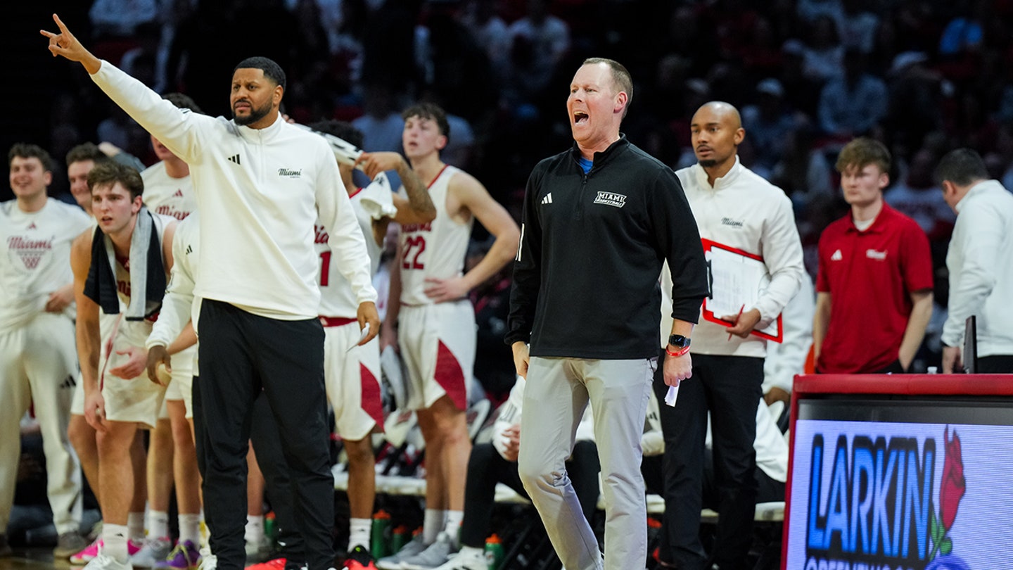 Miami (OH) RedHawks head coach Travis Steele works the sideline against the Ohio Bobcats in the second half at Millett Hall on February 13, 2026. (Aaron Doster/Image Images)
