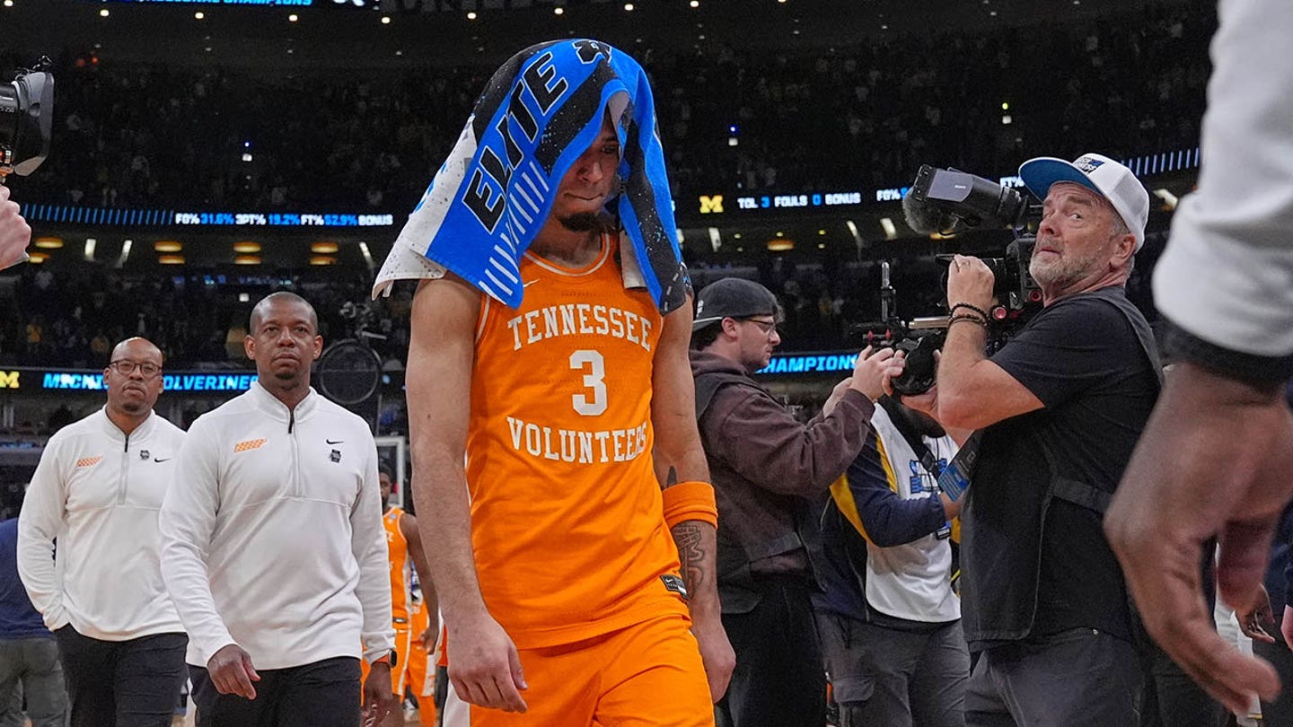 Tennessee’s Bishop Boswell (3) walks off the court after losing to Michigan in the Elite Eight of the NCAA college basketball tournament, Sunday, March 29, 2026, in Chicago. (AP Photo/Nam Y. Huh)