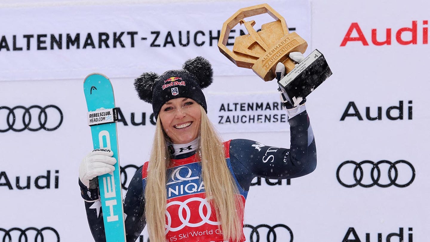 Lindsey Vonn of the United States celebrates on the podium after winning the women’s alpine skiing race at the FIS World Cup in Zauchensee on January 10, 2026. (Leonhard Foeger/Reuters via Imagn Images)