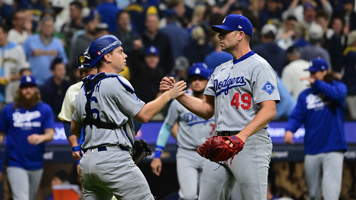 Los Angeles Dodgers catcher Will Smith (16) and relief pitcher Blake Treinen (49) react after defeating the Milwaukee Brewers during Game 1 of the National League Championship Series at American Family Field. (Benny Sieu/Imagn Images)