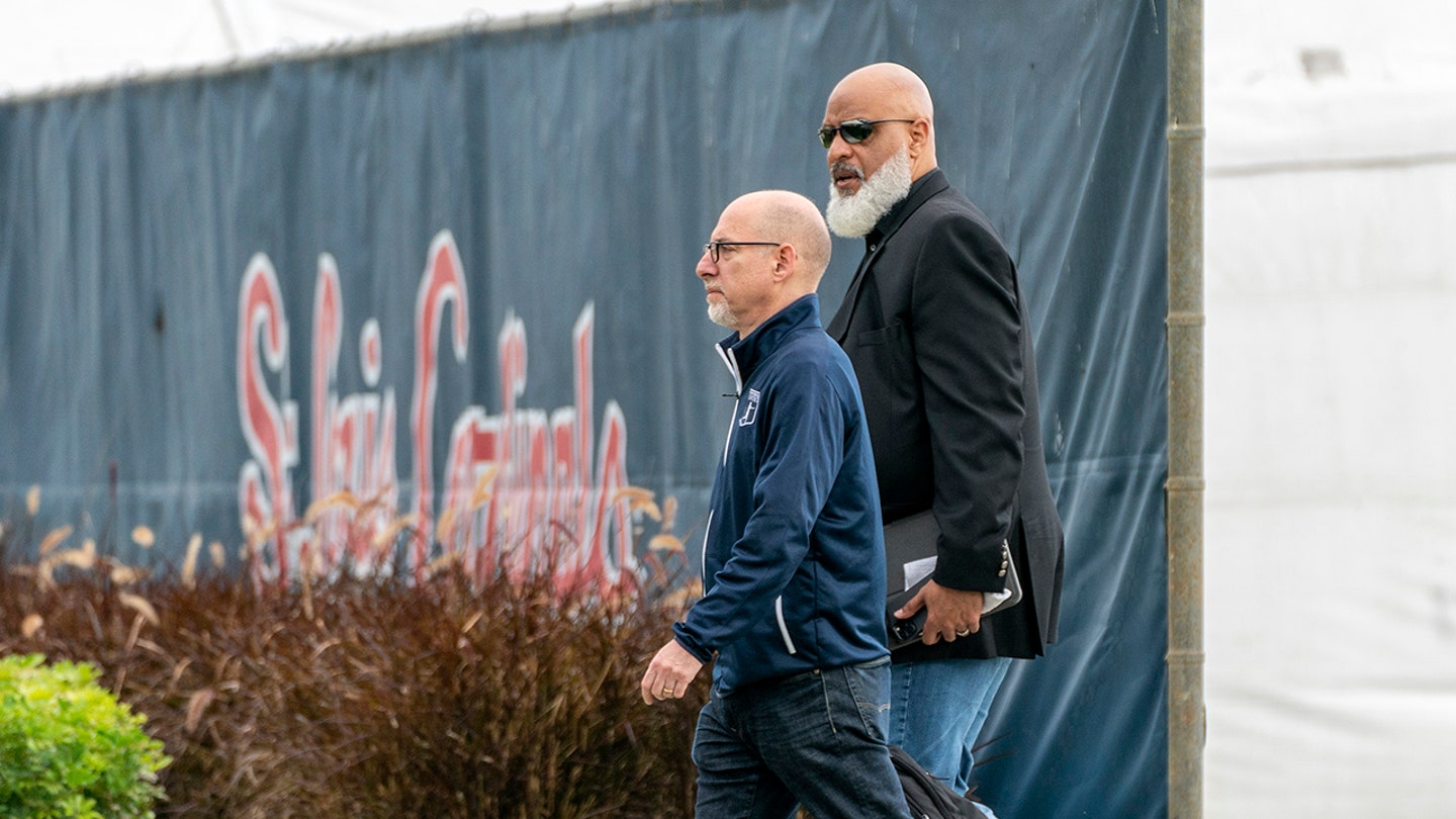 Major League Baseball Players Association CEO Tony Clark, right, and chief negotiator Bruce Meyer arrive to negotiate with the players’ union in an attempt to reach an agreement to save the March 31 openers and a 162-game season at Roger Dean Stadium in Jupiter, Florida, on March 1, 2022. (Greg Lovett/RED USA TODAY)