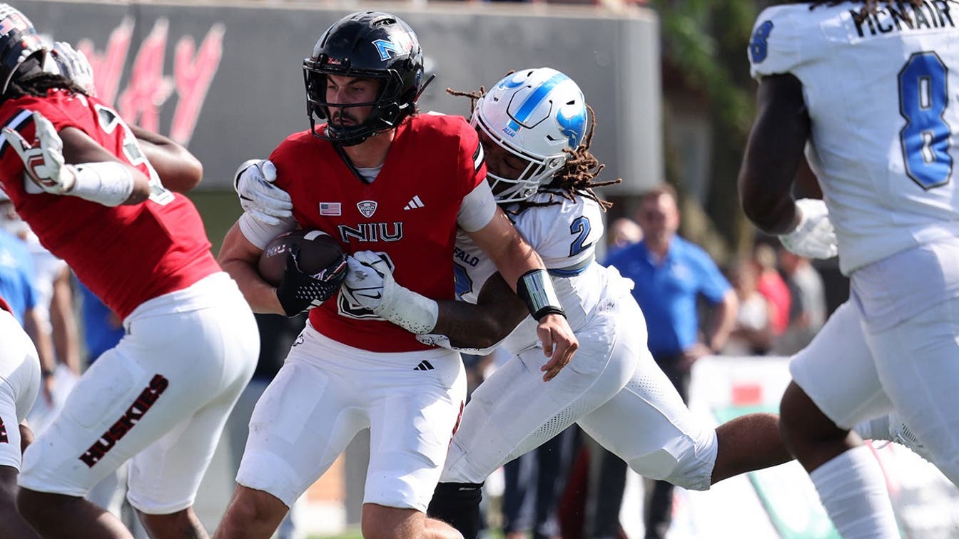 Northern Illinois Huskies quarterback Ethan Hampton (2) runs the ball against Buffalo Bulls linebacker Red Murdock (2) during the first half at Huskie Stadium on Sept. 21, 2024. (Mike Dinovo/Image Images)