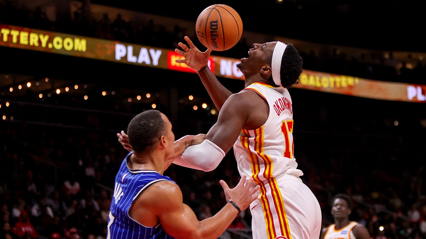Onyeka Okongwu (17) of the Atlanta Hawks is fouled by Desmond Bane (3) of the Orlando Magic during the third quarter at State Farm Arena in Atlanta on Nov. 4, 2025. After an official review, Bane was charged with a technical foul and ejected after hitting the ball at Okongwu while he was lying on the ground. (Kevin C. Cox/Getty Images)