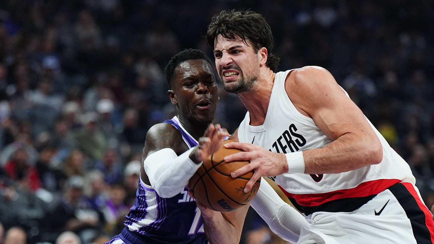 Portland Trail Blazers forward Deni Avdija (8) attempts to pass Sacramento Kings guard Dennis Schroder (17) during the first half of an NBA basketball game on Saturday, Dec. 20, 2025 in Sacramento, California. (AP Photo/Alan Greth)