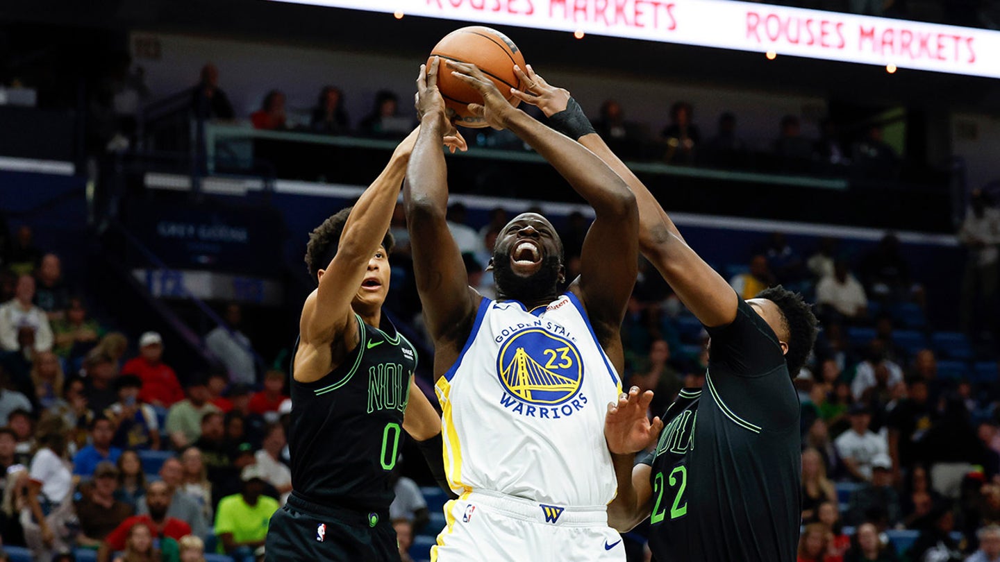 New Orleans Pelicans center Derik Queen (22) and guard Jeremiah Fears (0) strip the ball from Golden State Warriors forward Draymond Green (23) as he drives to the basket during the first quarter of an NBA basketball game, Sunday, Nov. 16, 2025, in New Orleans. (AP Photo/Butch Dill)