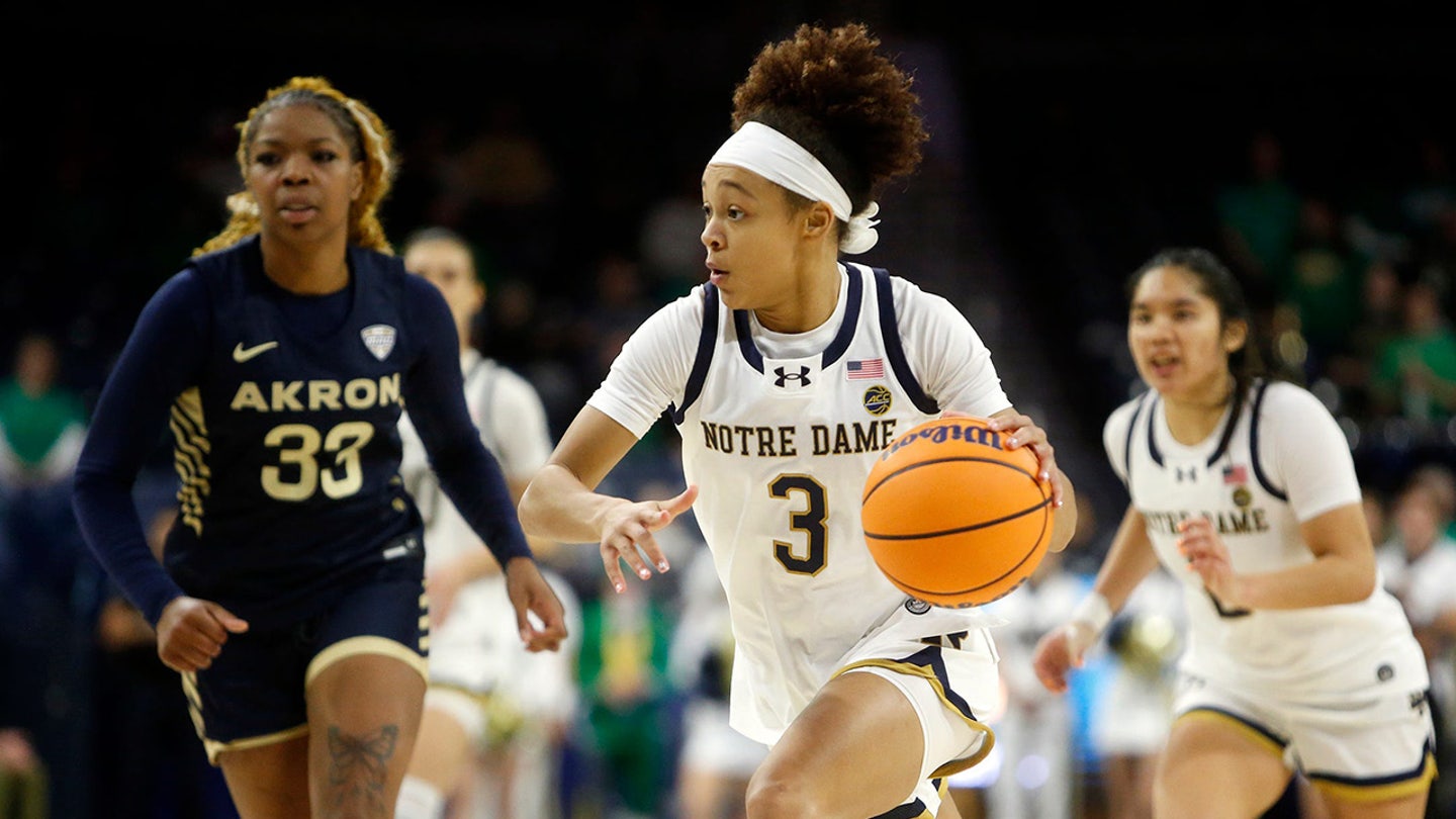 Notre Dame junior Hannah Hidalgo (3) steals the ball from Akron’s Keiryn McGuff during an NCAA women’s college basketball game between Notre Dame and Akron on Wednesday, Nov. 12, 2025, at Purcell Pavilion in South Bend, Indiana. (Austin Hough / South Bend Tribune / USA TODAY NETWORK via Imagn Images)